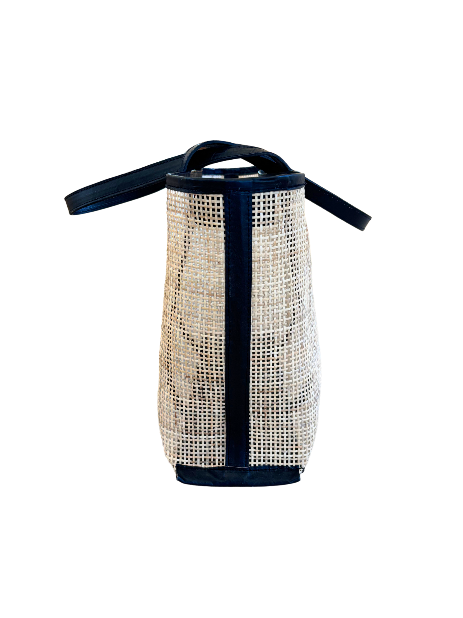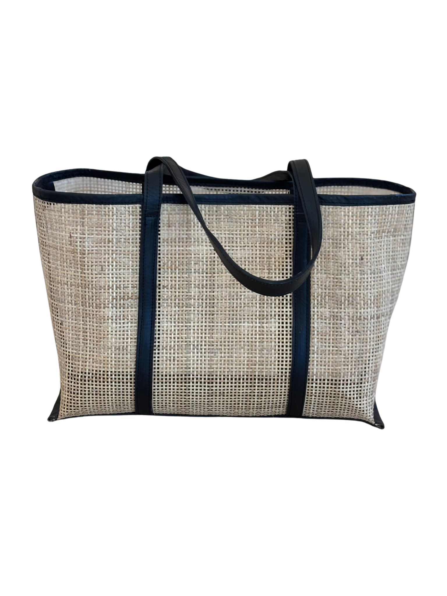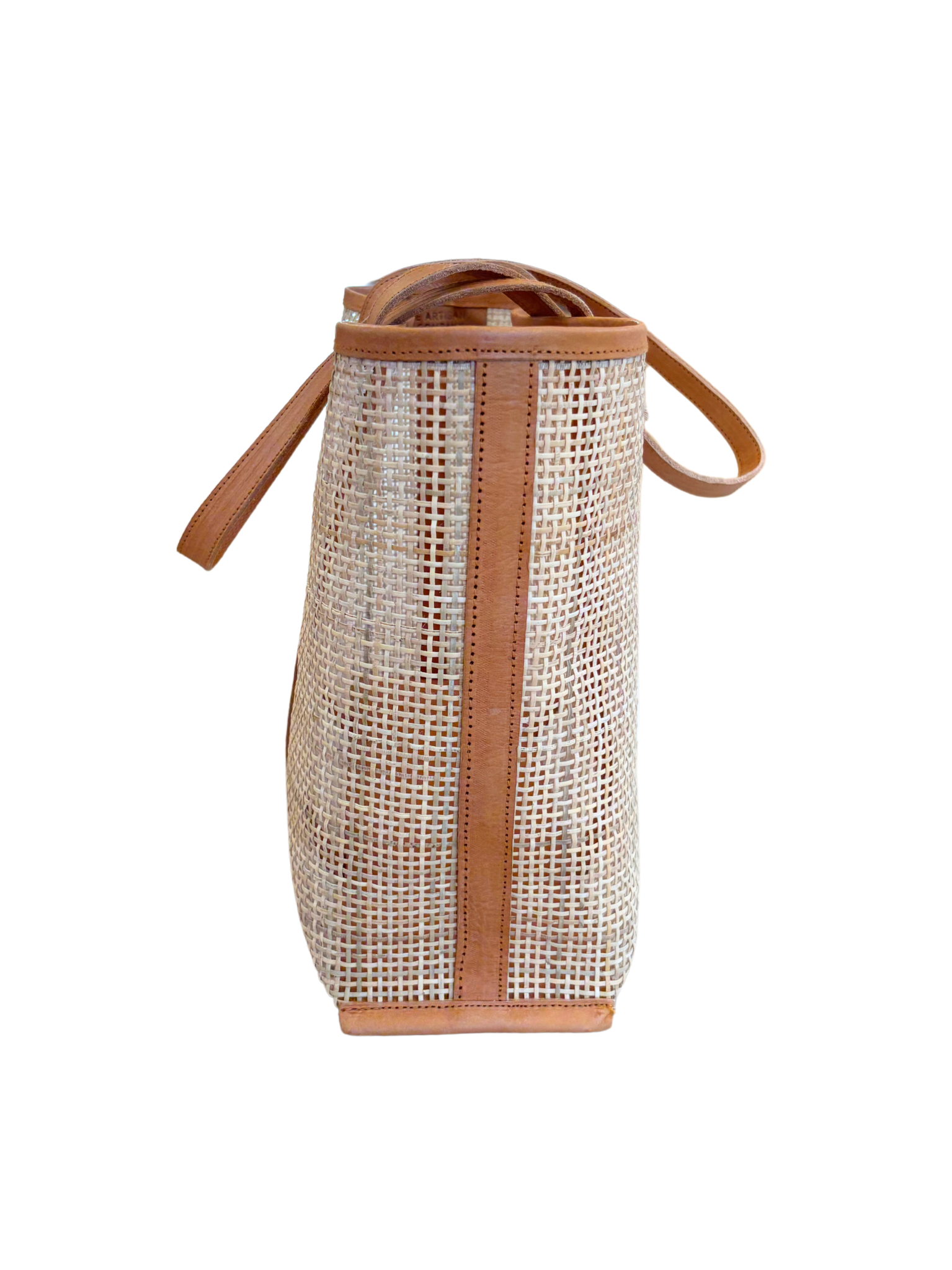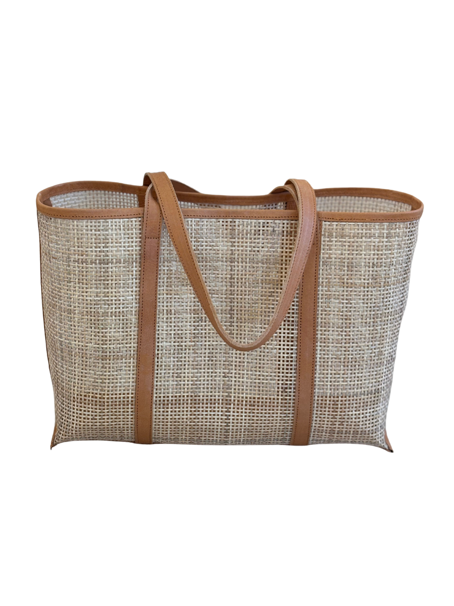This structured beach bag balances the warmth of rattan with the sleekness of tan cowhide leather for a contemporary take on coastal style.